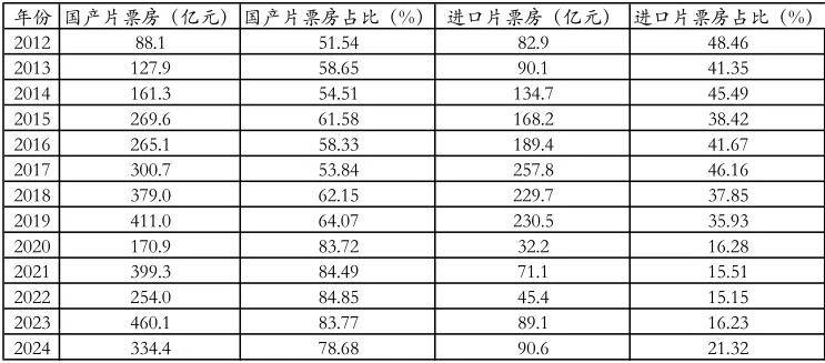 在近十五年来进口片票房占比最高的2012年,年度票房前十中好莱坞占据七席,前二十中占据十四席,国产片需借助一系列非正式保护政策和大量合拍作品,才能稍稍压过进口片。