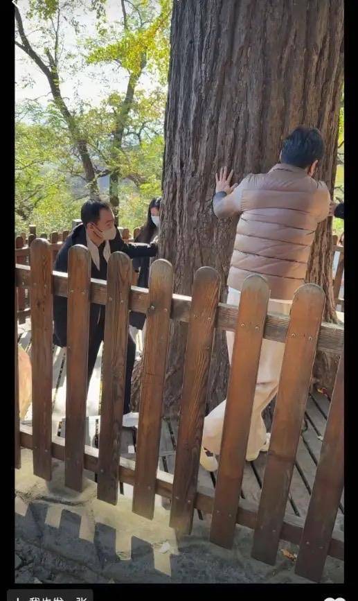 辛柏青和女儿在银杏树旁转圈,脸上显得有些严肃,仿佛在对着树诉说着什么永恒的心愿。
