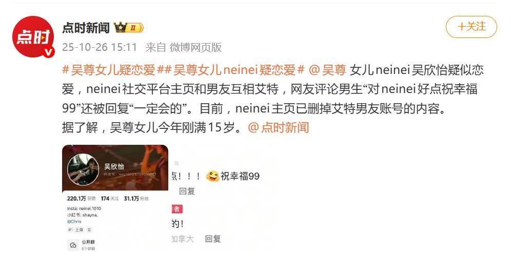 这回,轮到曾经的“女儿奴”吴尊面对自家“小公主”的成长考题了。据10月26日报道,吴尊15岁的女儿NeiNei被爆疑似恋爱,在社交平台与一名男生账号公开互相关注并艾特,瞬间点燃了全网吃瓜群众的热情。