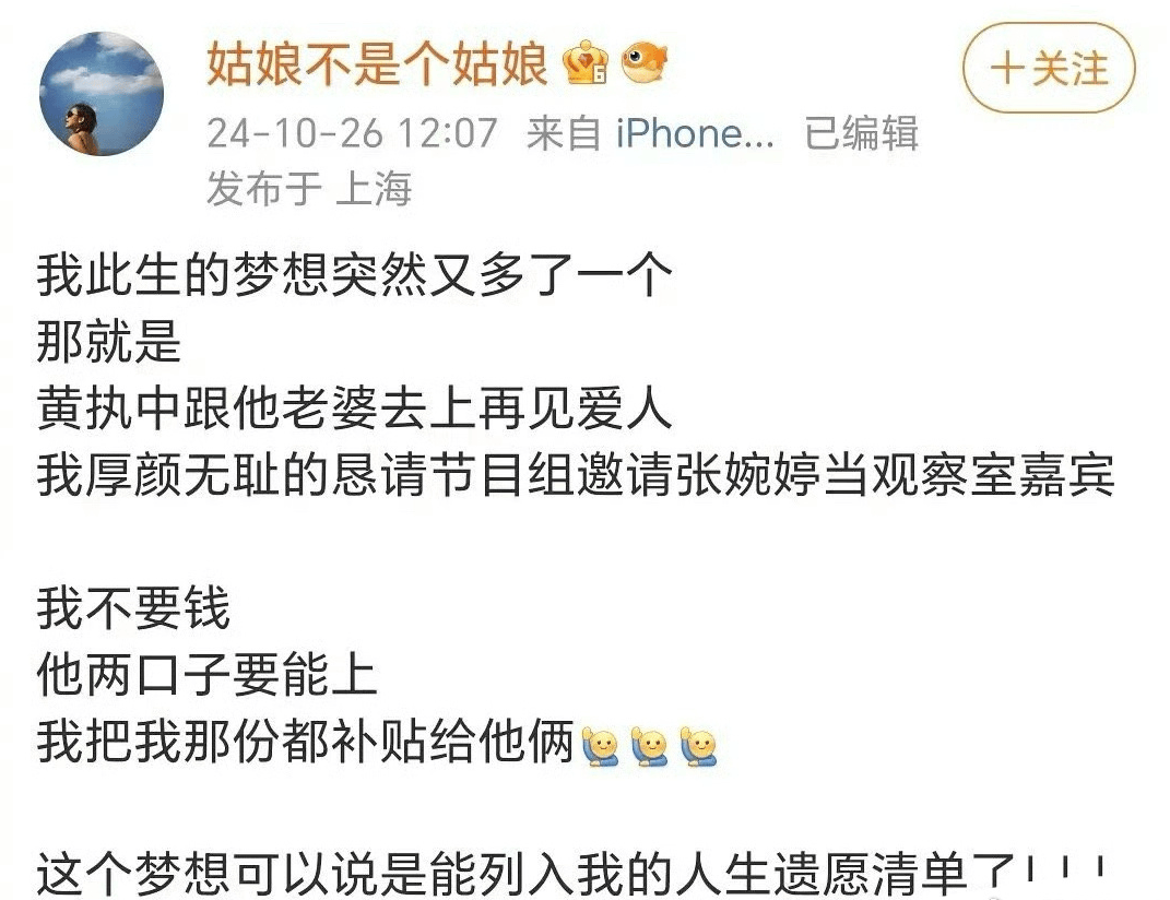 第二季嘉宾张婉婷在微博喊话让黄执中也去参加情感综艺。(图/微博@姑娘不是个姑娘)