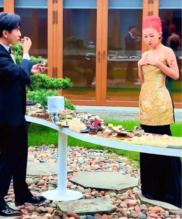 敬酒时刘一丝又换了一身金色礼服,这身礼服倒是跟红色头发很搭配,看着潮流很多。