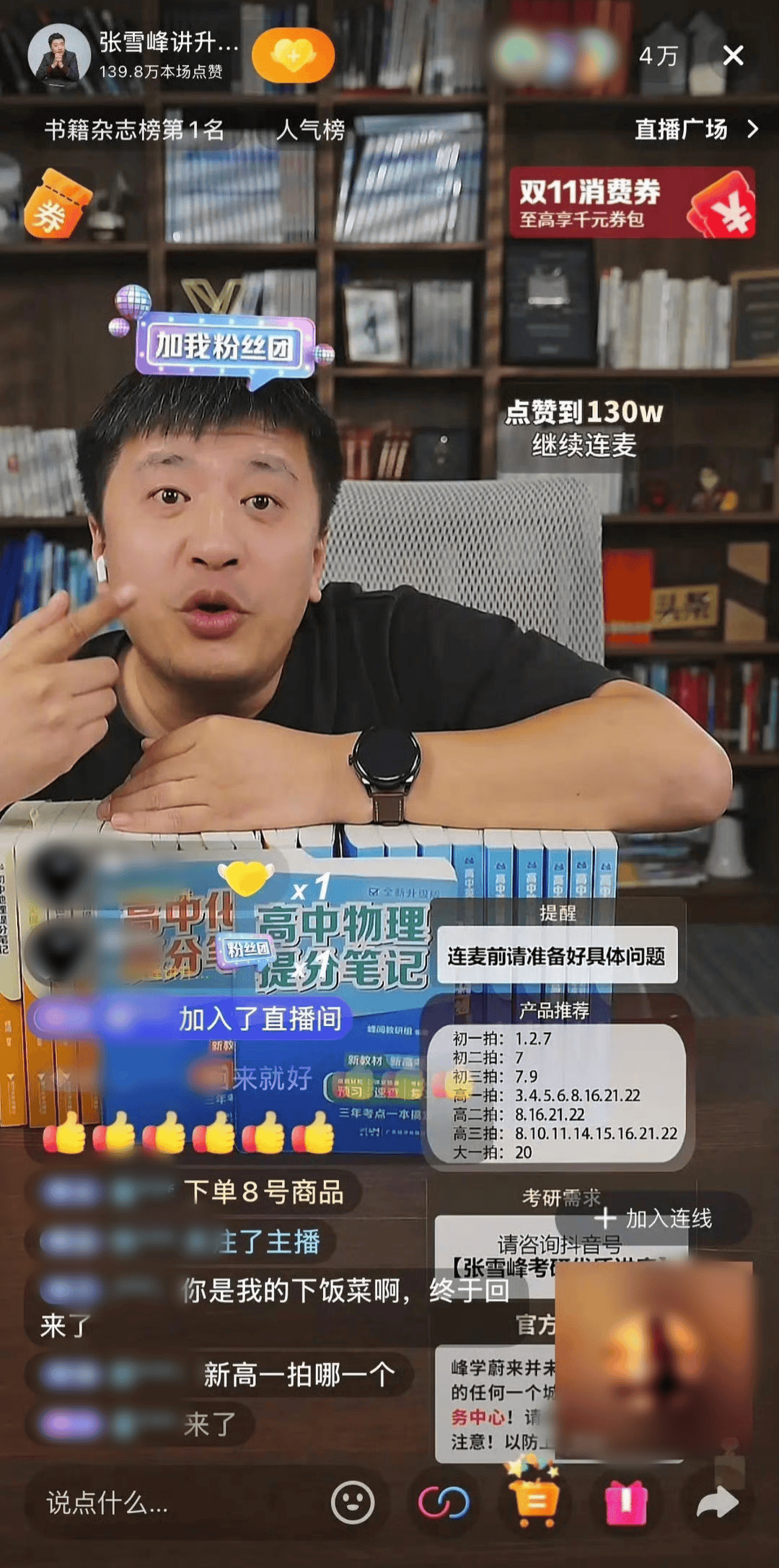 例如,在一位家长详细询问直播桌上的学习产品时,张雪峰表示自己被吓到了,让家长自己录屏,他不想回来第一天直播就上热搜,“我们今天晚上不卖货,只连麦,如果中间(家长)问到了,我会介绍一下什么东西能够帮到你,不想第一天回来直播,明天有个热搜说张雪峰首场直播疯狂卖货。”