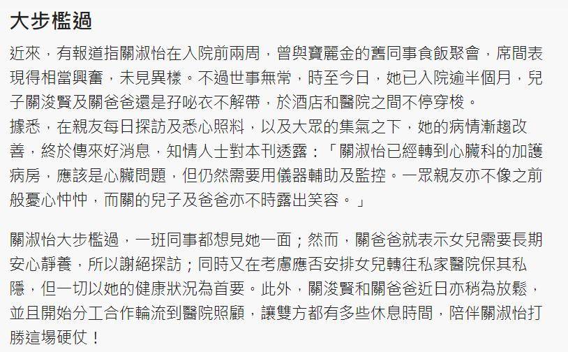 消息指,关淑怡此次出事应该是心脏问题,她情况虽然好转,但仍然需要用仪器辅助及监控病情。