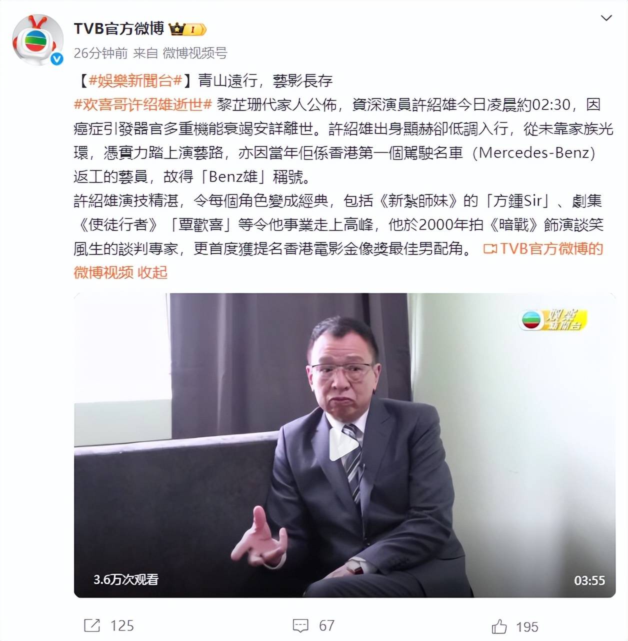 TVB也专门发了悼念内容,毕竟他是从无线艺员训练班出来的老人,陪着TVB走过好多年。