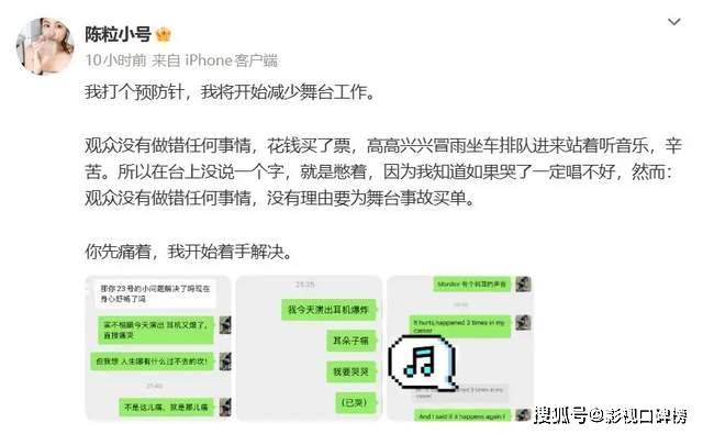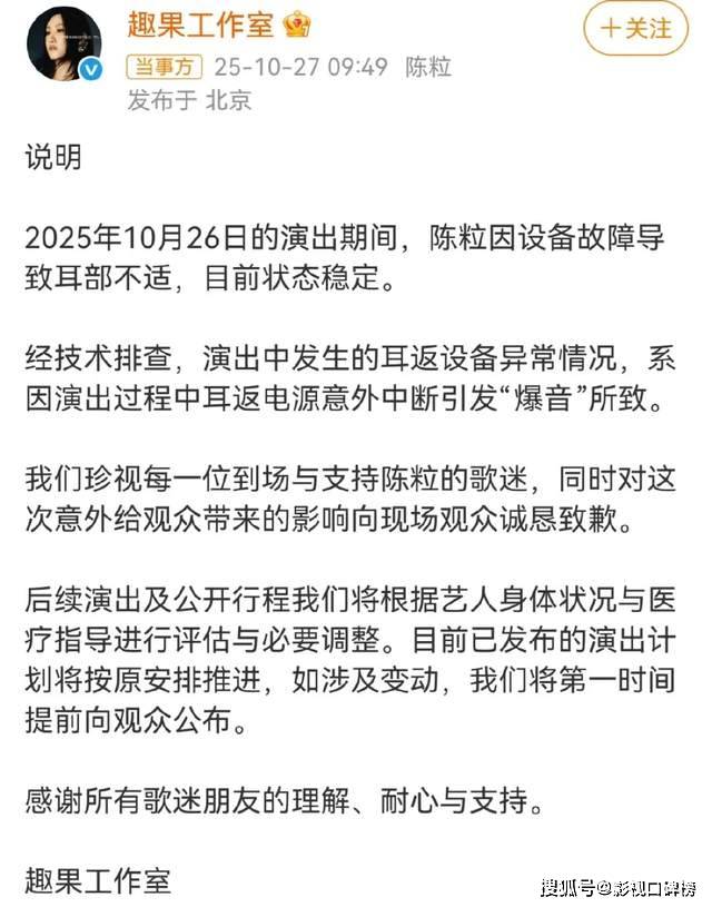 至于她在舞台上捂耳蜷缩,眼眶通红,纯是因为设备故障导致的耳部不适,并未造成无法挽回的伤害。其次,工作室向到场参加音乐节的听众们诚恳致歉,并承诺后续演出安排会以陈粒的身体状况为先,依据医疗建议做出适当调整。最后为了让陈粒的歌迷朋友们放心,工作室还强调已公布的演出暂按照原计划推进,若有变动会另行通知。