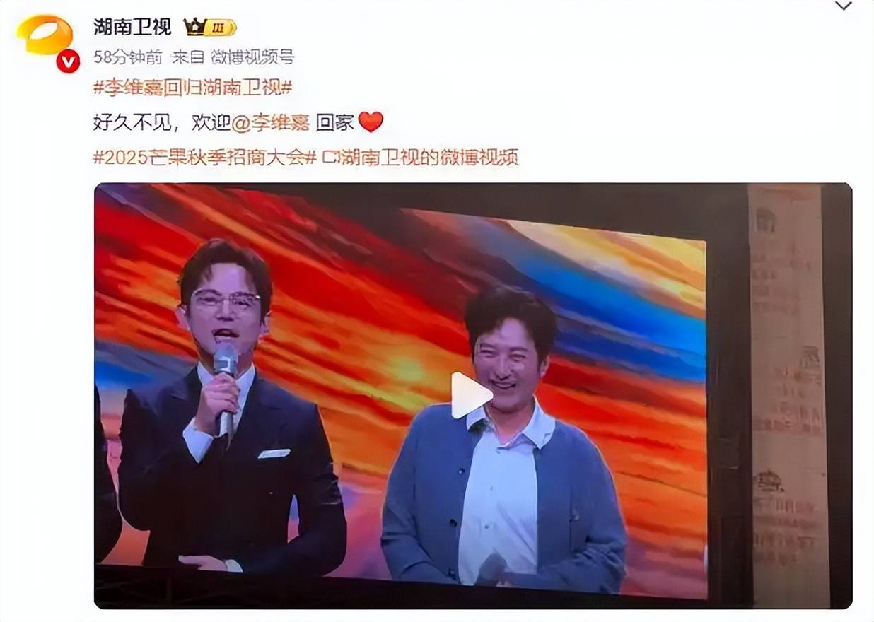 10月28日下午,湖南卫视社交账号发布李维嘉登台亮相的视频,配文“好久不见,欢迎回家”,并艾特了主持人李维嘉。