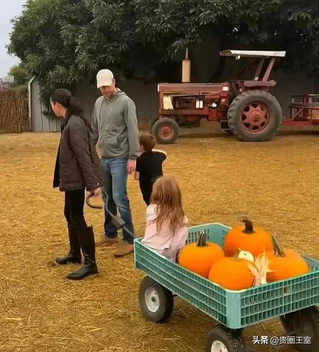 近日哈里王子一家五口出游照曝光,画面中哈里梅根带着阿奇王子和莉莉贝特公主一起采摘南瓜。