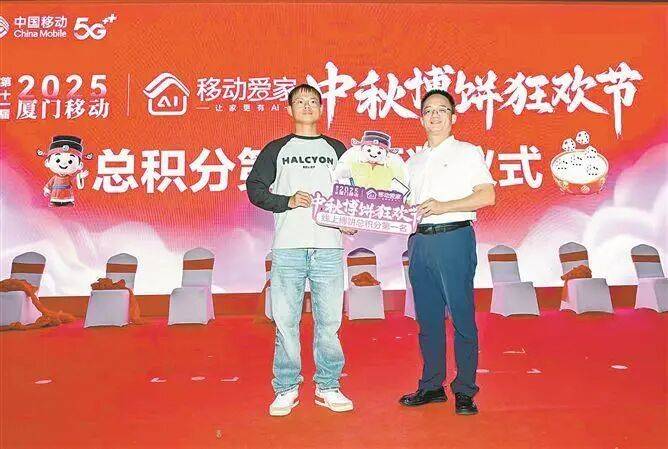 据了解,今年的线上博饼活动,博饼次数近650万次,主办方感谢广大市民对厦门移动的大力支持和热情参与。活动现场,中国移动福建公司厦门分公司副总经理郑亚辉为今年获得2025厦门移动中秋线上博饼总积分第一名的施先生颁发大奖。