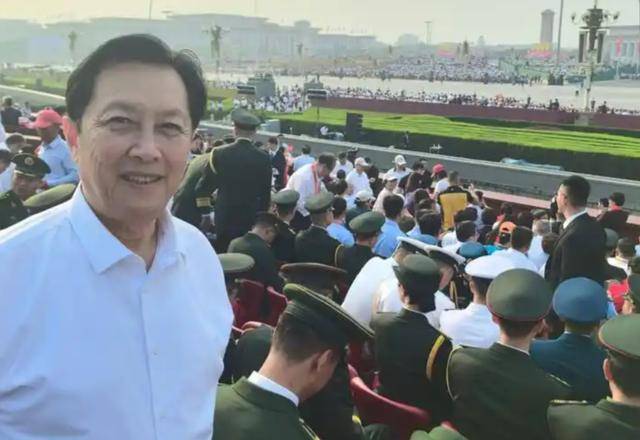 他身着白衬衫、神情庄严,端坐在观礼台前,认真观看受阅队伍通过。