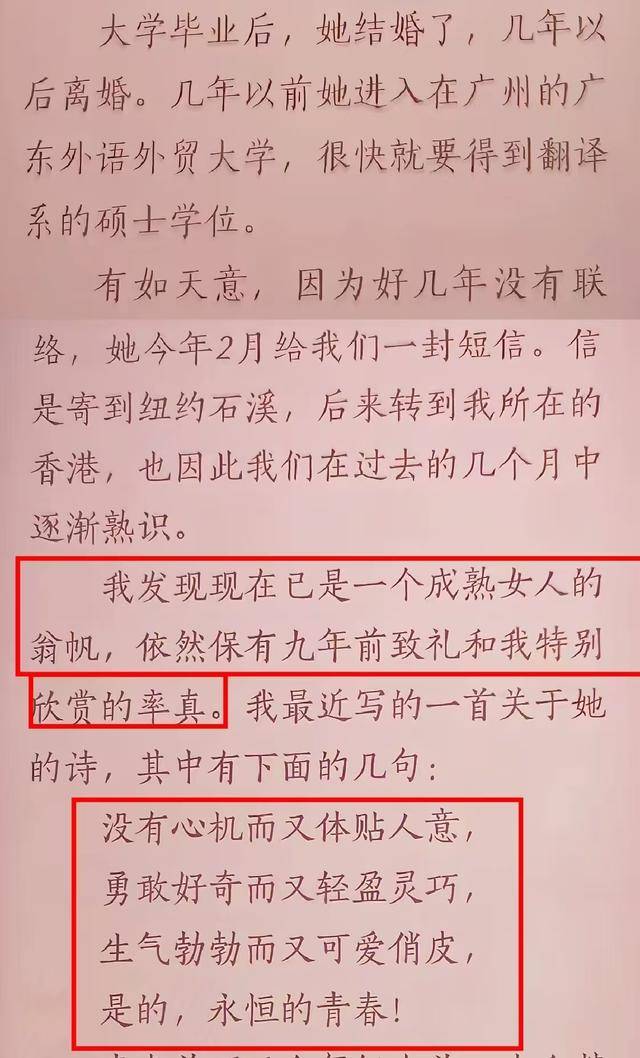 大学毕业后,翁帆经历了一场失败的婚姻,不仅没颓废,反而奋发图强,考上了研究生,她变得成熟又不失率真,令杨振宁着迷,还特意作诗一首,再次赞扬翁帆没有心机,还夸她体贴、勇敢、可爱又俏皮,最重要的是青春靓丽。