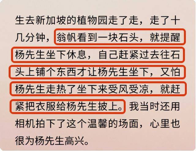 翁帆照顾的有多好?杨振宁好友葛墨林提到这么一件小事,去植物园散步时,走了十几分钟,翁帆就让杨振宁坐在石头上休息,坐下前,翁帆在石头上铺好东西,坐下后,翁帆为杨振宁披上衣服,这份细致几十年如一日的习惯。