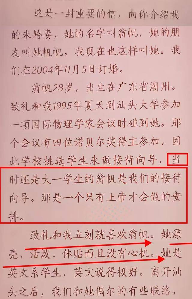 邮件开头,杨振宁就宣布了和翁帆订婚时间,紧接着介绍两人的缘分,1995年他和杜致礼到汕头大学参加国际物理学家会议时,刚上大一的翁帆负责接待两人,这简直是上帝做出的安排。