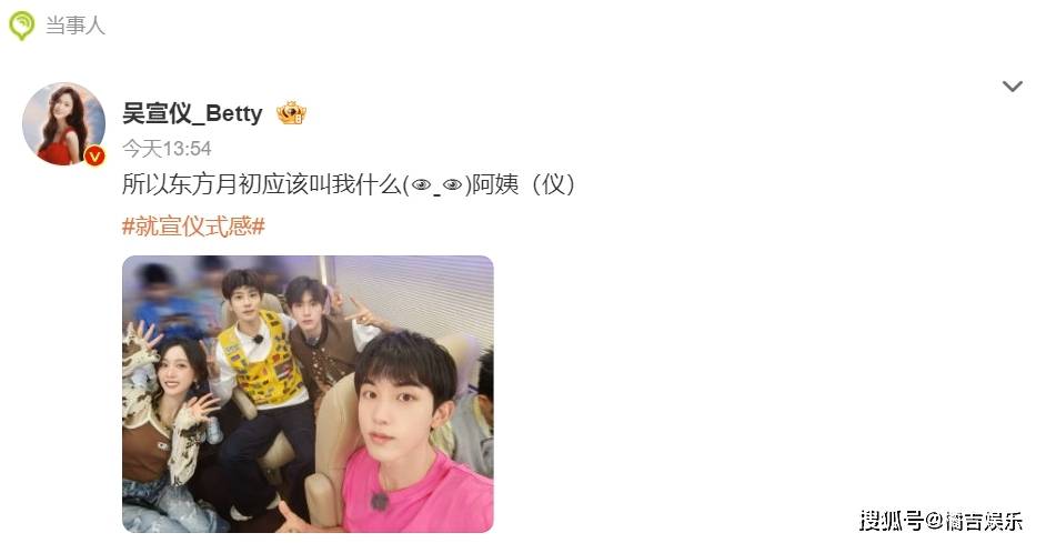 随着照片的曝光,网友们纷纷脑洞大开,尤其是针对“东方月初应该叫吴宣仪什么?”这一灵魂拷问,更是引发了无数创意与笑料。有人戏称“阿姨(仪)”,巧妙结合了吴宣仪的名字与东方月初可能的辈分认知,既幽默又不失亲切;也有人提出“前辈”、“师姐”等称呼,试图在尊重与亲近之间找到平衡点。