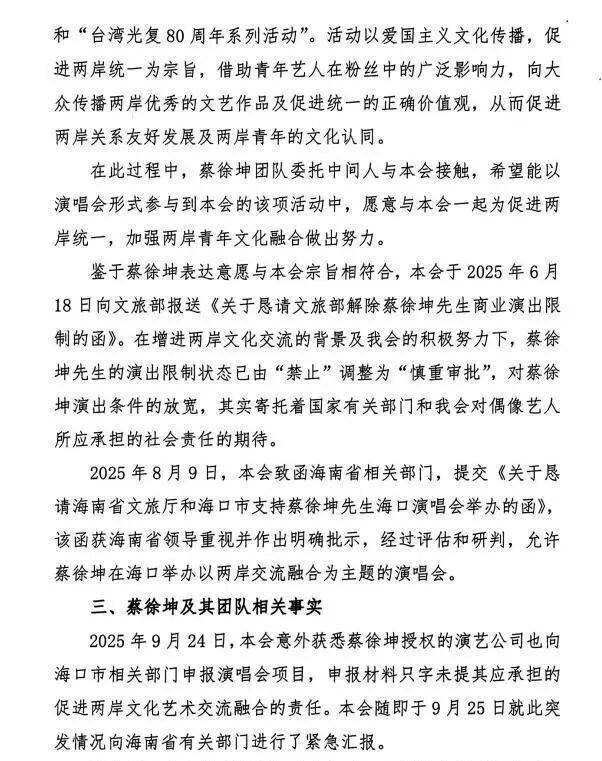 事件简述:蔡徐坤因为在大陆被限制开演唱会,找了台促会出面,帮他申请解除限制,而台促会帮他的条件就是演唱会以促进两岸统一为主题。
