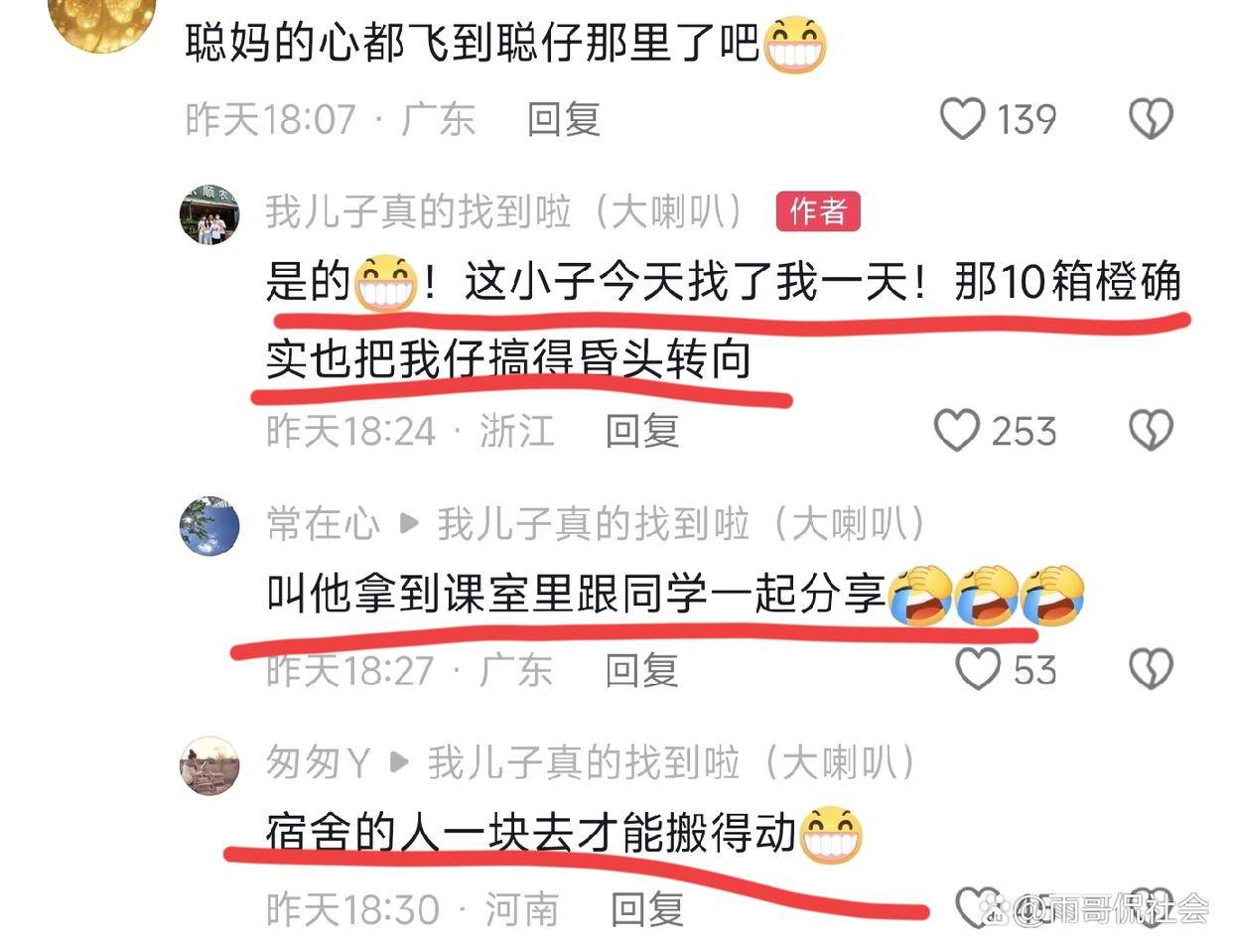 昨天在叶锐聪妈妈账号留言区看到她和网友聊天,听说她给叶锐聪寄了10箱橙子,
