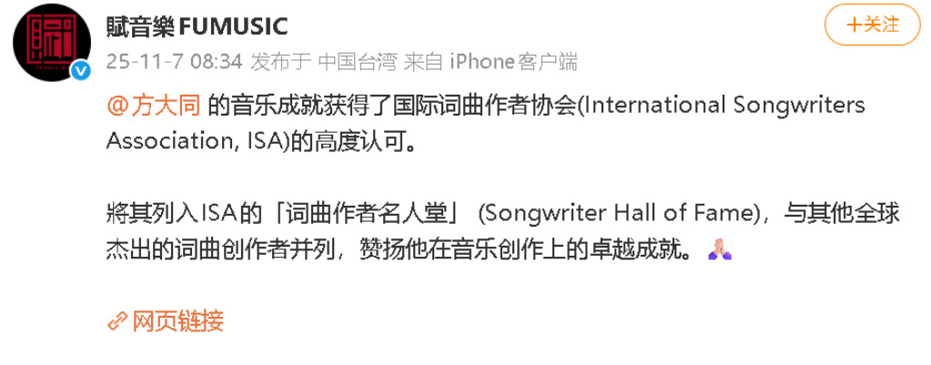 搜狐娱乐讯 近日,据方大同公司公布,方大同被列入ISA词曲作者名人堂,公司表示:“方大同的音乐成就获得了国际词曲作者协会(International Songwriters Association, ISA)的高度认可。將其列入ISA的「词曲作者名人堂」 (Songwriter Hall of Fame),与其他全球杰出的词曲创作者并列,赞扬他在音乐创作上的卓越成就。”