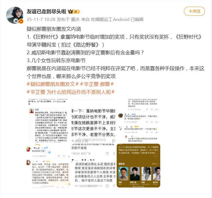 11月7日,有网友爆料,一则疑似演员郝蕾的朋友圈截图突然引爆网络。图中内容直指三大国际电影节奖项公正性,其中对辛芷蕾凭借《日掛中天》斩获威尼斯影后的质疑尤为尖锐——“靠一个‘扯头发’的片段就能拿影后,这种奖还有含金量吗?”