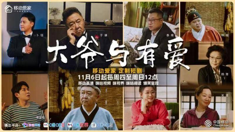 11月6日,中国移动移动爱家定制奇幻生活短剧《大爷与有爱》正式登陆移动高清、咪咕视频、咪视界、咪咕阅读等平台。该剧由于谦、蒋诗萌、泰维领衔主演,孙越、李宗恒、关凌、杨青、卜钰、曹贺军、童飞、周英俊、刘宏禄等特邀主演,聚焦当代家庭生活,从于谦扮演的退休大爷于有艾视角切入,通过一系列奇幻色彩的爆笑故事,以不同代际间跨越年龄的双向互动,引发观众对当下生活与爱的深度思考。