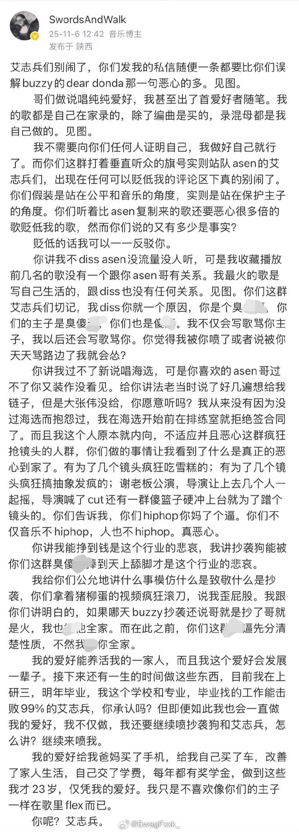 Rapper 剑走发文开怼“艾志兵”后被质疑抗压能力不行,结果剑走再度开骂: