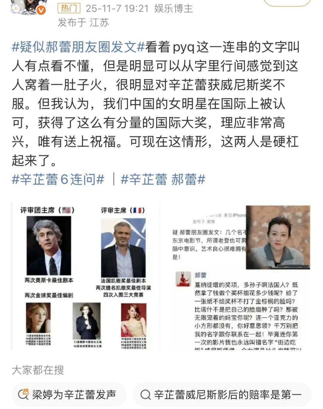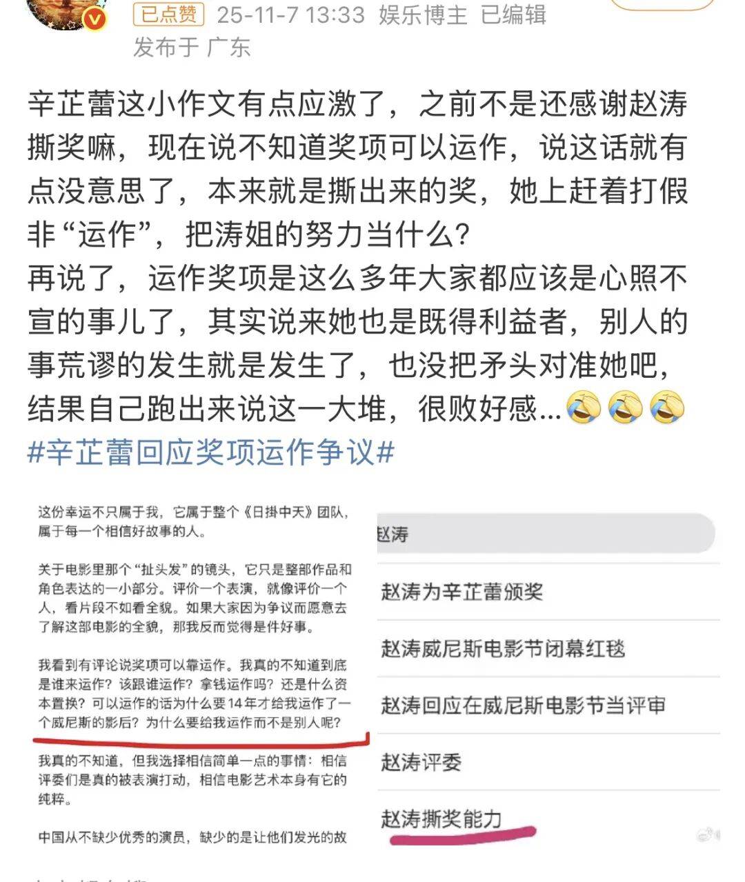 再说了,当初辛芷蕾得奖的时候,“赵涛撕奖能力”这热搜可是高高挂在一位。