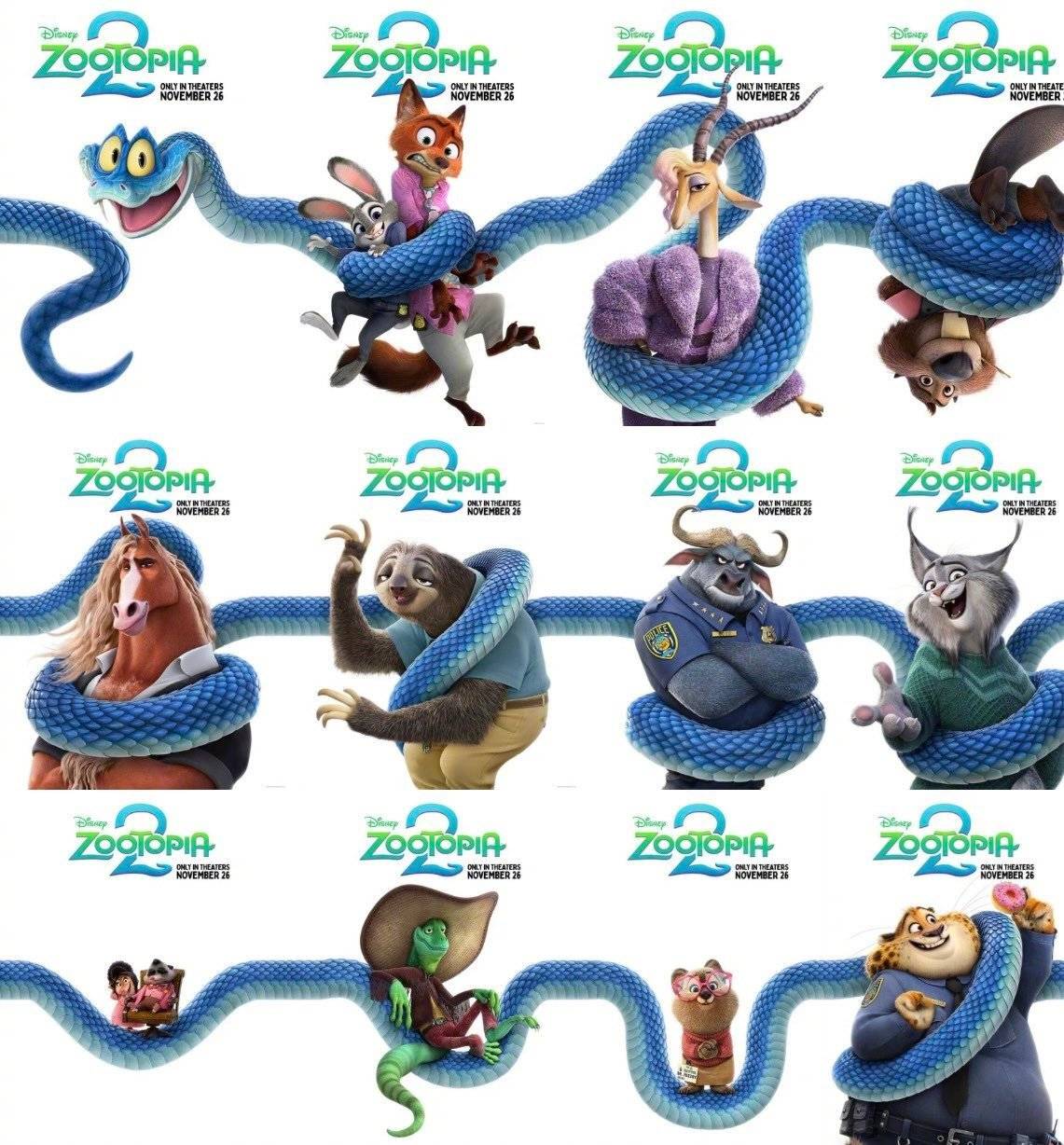 搜狐娱乐讯 《疯狂动物城2》发布角色海报,蛇年新角色“蛇Gary”发动“长蛇阵”,将动物城里的主要角色们“缠”在一起。