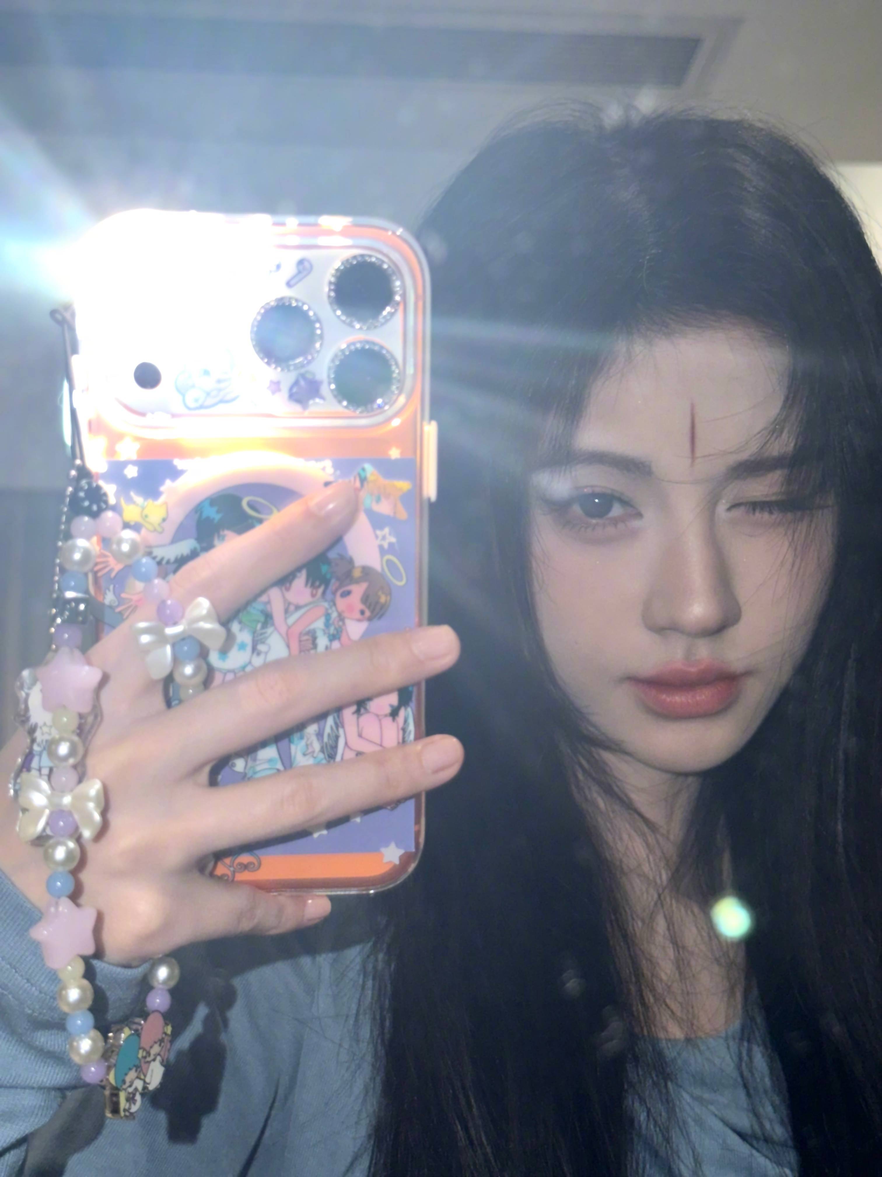 鞠婧祎妆容别致,表情酷飒。