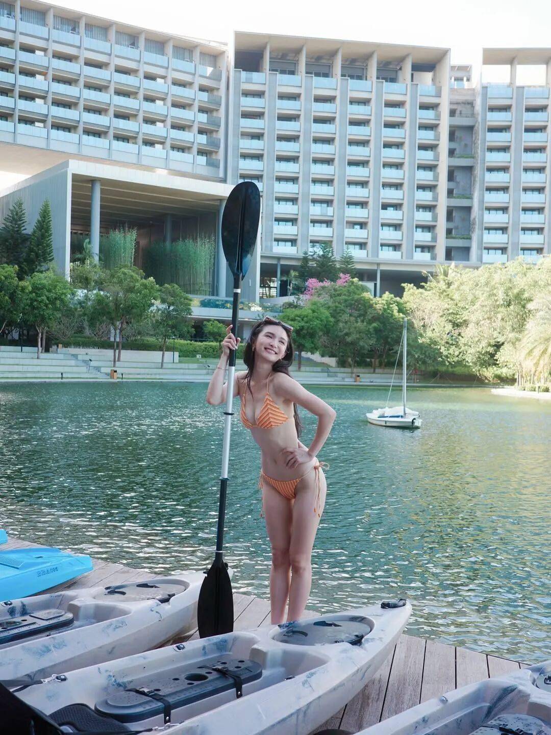 近日,两人一同前往海南岛旅游,关枫馨在社交网晒出多张比基尼靓照,只见她身穿橙白相间的绑颈细带比基尼,在镜头前摆出多个姿势,尽显玲珑有致的身材曲线。虽然关枫馨个子娇小仅1.61米,但遗传了父母的高颜值,身材比例也十分众。