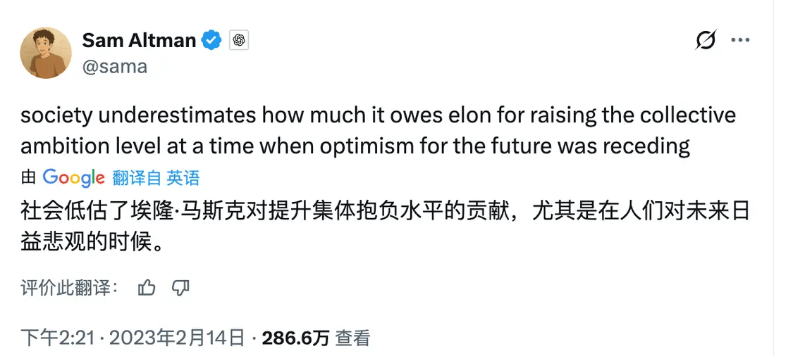 奥特曼在2023年2月13日在X发布的赞扬帖子,被广泛解读为向马斯克伸出的橄榄枝。此时,马斯克已经开始公开批评OpenAI的商业化转向。