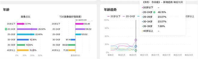 从数据显示,在首映前期,25-34岁的观众比例占据很大,这种比例也反映了这个IP对于这群观众的深远影响。但从折线图能看到,00后观众(20-24岁)的比例在映后近乎直线式的增长。