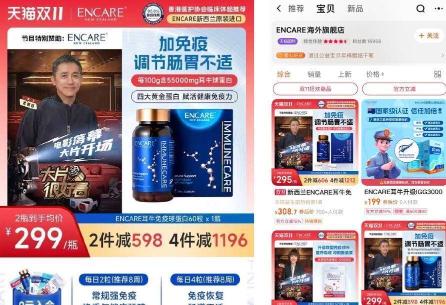 截图中,一家名为“ENCARE海外旗舰店”的天猫国际店铺,在其销售的“新西兰ENCARE耳牛免疫球蛋白”保健品首页使用了梁朝伟的半身照。 这款商品售价200多元,但详情页并未标明梁朝伟是产品代言人。