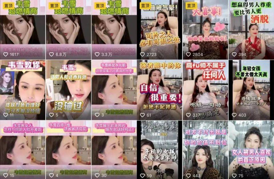 大范围的切片传播是情感主播们提高生产力与触达人群面的重要方式。“曲曲大女人”在被封禁后,有包括“美人曲曲解忧铺”“曲曲小诸葛yyds”“曲大洋-美人解忧铺”等众多矩阵账号进行直播切片传播。韦雪也有“雪雪很清醒”“雪雪分享站”“雪儿姐”等账号全网火力全开输出自己的感情金句。