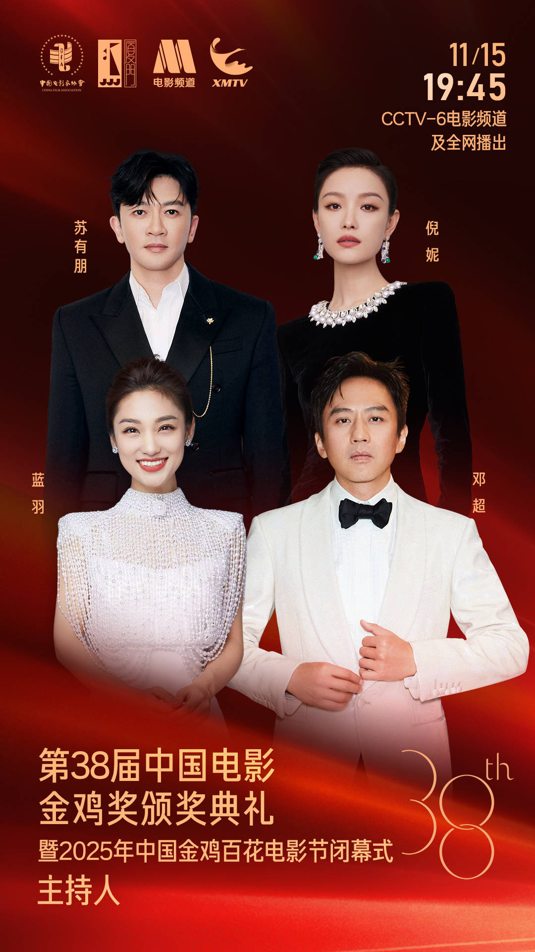 搜狐娱乐讯 13日,第38届中国电影金鸡奖颁奖典礼暨2025年中国金鸡百花电影节闭幕式主持阵容官宣,由电影频道主持人蓝羽、邓超、苏有朋、倪妮联袂主持,以“电影主持人+电影人”的组合,专业见证中国电影年度荣耀时刻。本届金鸡奖颁奖典礼暨闭幕式将于11月15日晚19:45举行。