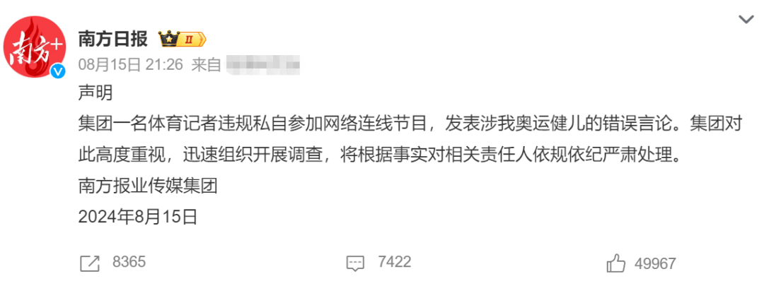 根据最新消息,某日报已经发出声明,称该记者是违规私自网络连线,而且涉及对奥运健儿有错误言论,他们会组织展开调查,依规对该记者进行严肃处理。