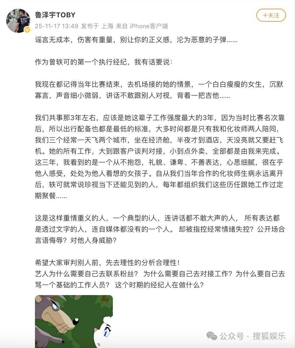 11月17日上午,一位自称是曾轶可团队前员工的网友发布长文↓