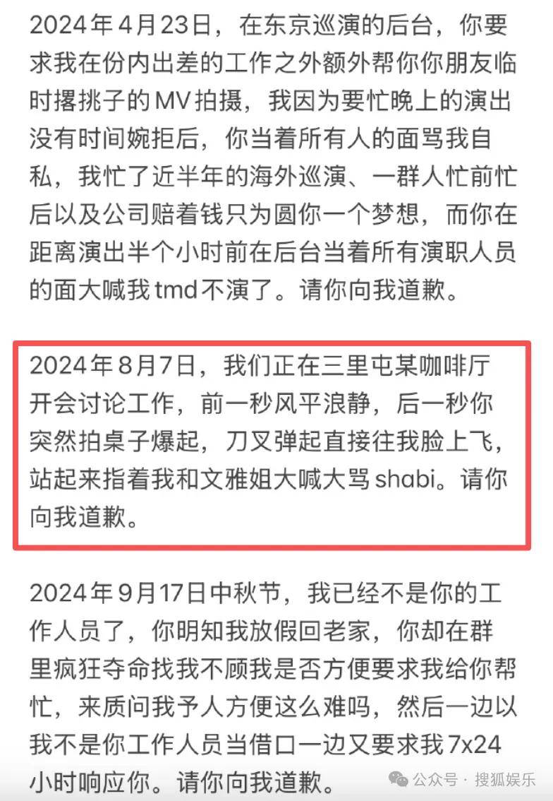 不仅让工作人员主动私联粉丝、要求工作人员24小时待命,还多次对工作人员进行言语羞辱、人身攻击、威胁等职场霸凌行为等。