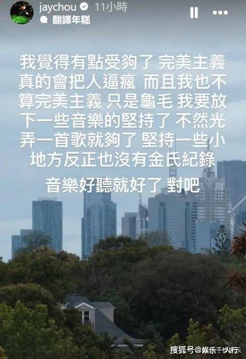 周杰伦在IG上坦言:“我觉得有点受够了,完美主义真的会把人逼疯,而且我也不算完美主义,只是龟毛,我要放下一些音乐的坚持了,不然光弄一首歌就够了。 ” 这种自我和解的尝试,可能正是他突破创作瓶颈的关键。