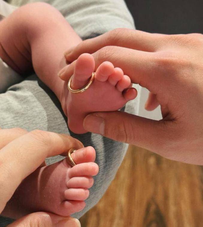 夫妻俩还晒出张神仙合照:把两枚婚戒轻轻套在女儿的大拇脚趾上,两人各握一只小脚,金属戒指衬得小脚趾粉嫩可爱,这波 “爱的传承” 操作直接把温馨值拉满。