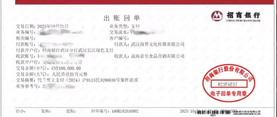 据兰世立提供给媒体的付款单据,10月21日,武汉商界文化传媒有限公司向益海嘉里支付了10万元,并写明这是代兰世立支付该名誉纠纷案的案件款项。