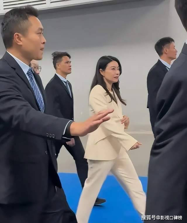 最瞩目的是当然是昔日“跳水女皇”郭晶晶。她穿着一身白色西装,简约又干练,一头长直发披散着,看上去很柔顺,平时很用心打理。还戴着眼镜,她的眼睛近视很深。郭晶晶脚上踩着高跟鞋。一身的打扮显得很高,身材纤瘦。