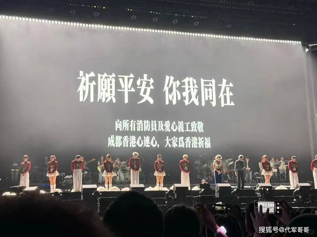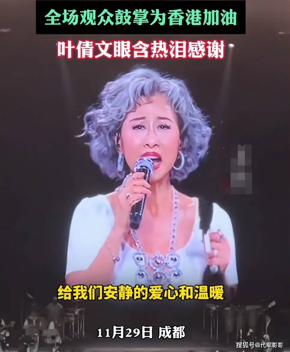 11 月 29 日,林子祥叶倩文 “白头到老” 成都演唱会开场不久,叶倩文突然以沉重语气请全场安静,伴随大屏幕转黑,带领万名观众为香港火灾默哀祈福。她哽咽着向配合的歌迷致谢,现场歌迷随后齐声高呼 “香港加油”,场面庄重而温暖,展现出跨越地域的同胞情谊。
