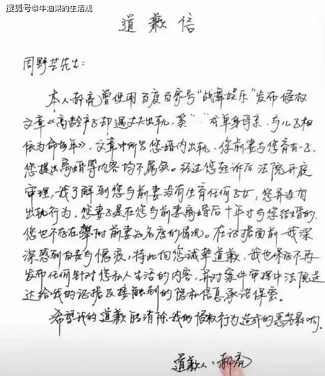 直到2023年,网络时代发达了,周野芒也能为自己发声了,他把造谣者告上法庭胜诉,造谣者写了手写道歉信,证实奚美娟和周野芒之间无共同孩子,周野芒没有背叛行为。