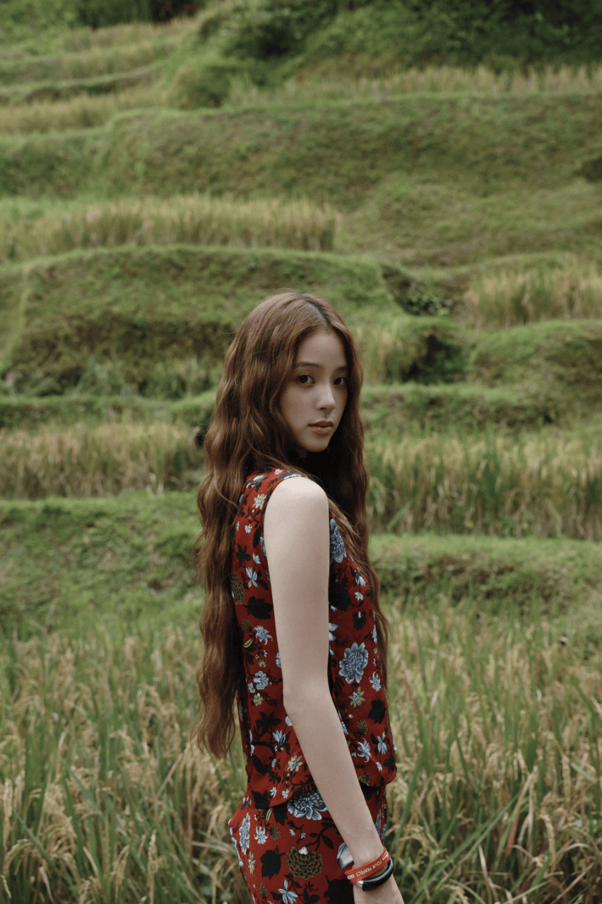 欧阳娜娜长发自然垂落,与山野田间形成对比。