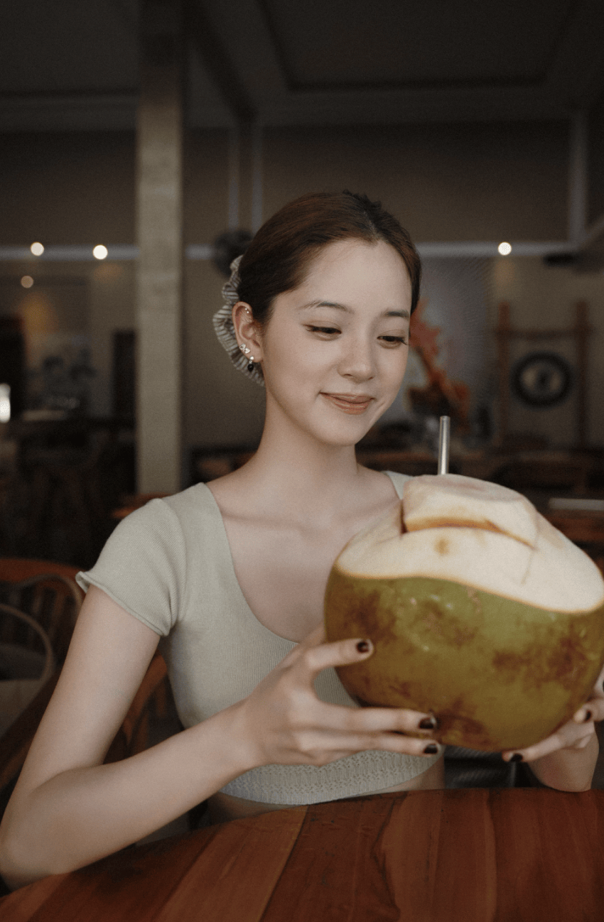 欧阳娜娜抱着椰子微笑,可爱有趣。