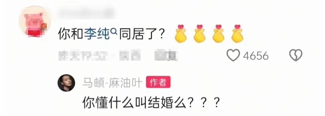 哪怕离婚和马頔连婚礼都没有办,但这并不影响他们秀恩爱。网络上被曝出马頔和李纯同居的消息时,马頔带点小得意的回应“你懂什么叫结婚么”?