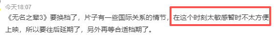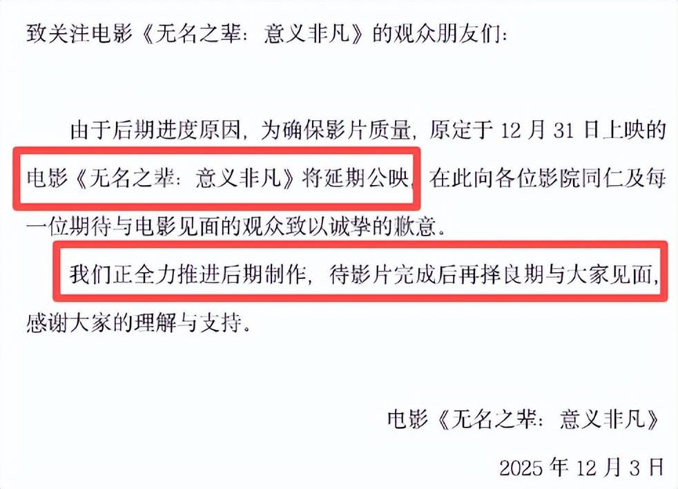 12月3日,电影官方突然发布公告:"因后期进度原因,为确保影片质量,原定于12月31日上映的《无名之辈:意义非凡》将延期公映。"