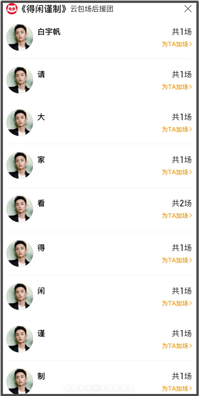 除此之外,杨烁、黄轩、杨洋、刘敏涛、白宇帆和章若楠等和正午阳光合作过的演员们也都包场为《得闲谨制》助力。据不完全统计,为《得闲谨制》包场的明星已经多达30余位,大多数人都是包了一场,包场数量最多的是杨烁和白宇帆,他们都是包了10场。