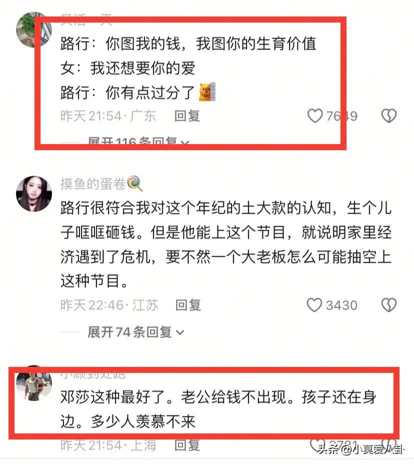 路行在节目中直言妻子人生最大成就是养育儿子,对邓莎的事业成就轻描淡写,不断重申"女性应当知足"的观点。这种居高临下的态度被观众戏称比知名企业家更显传统。