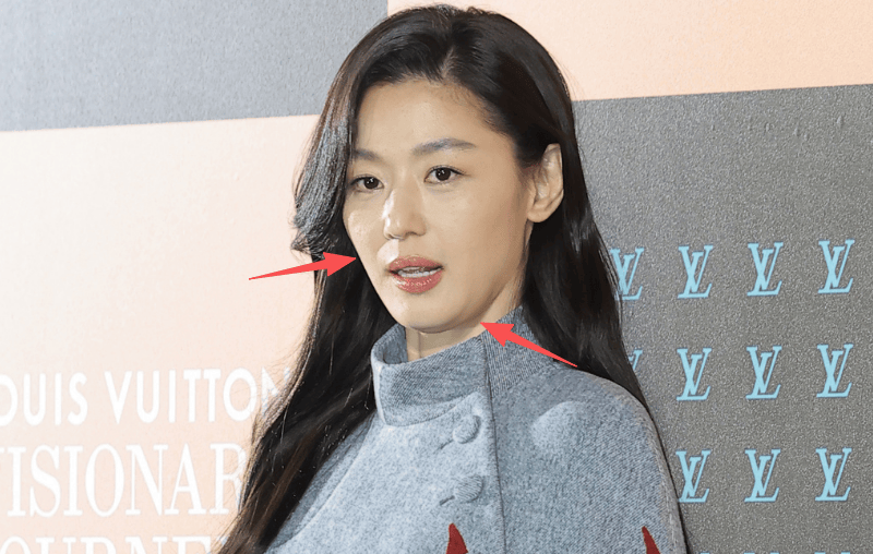 在风波之前,全智贤最爱营销的就是美貌,风波之后的容貌也是“见光死”,脸部垮了许多,双下巴不用多说,法令纹强光都遮不住。脸部肌肉坑坑洼洼,尤其是下巴直接变形,十分不自然。