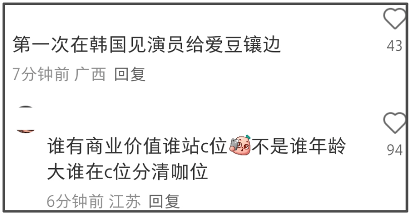 看到全智贤的站位,有网友表示第一次看到韩国演员给爱豆镶边,似乎是为其鸣不平,但并没有获得太多赞同声,直接被怼“谁商业价值大谁C位,并不是谁年龄大谁C分清咖位”,言语中充斥着对全智贤的不屑,由此可见全智贤的路人缘有多差。