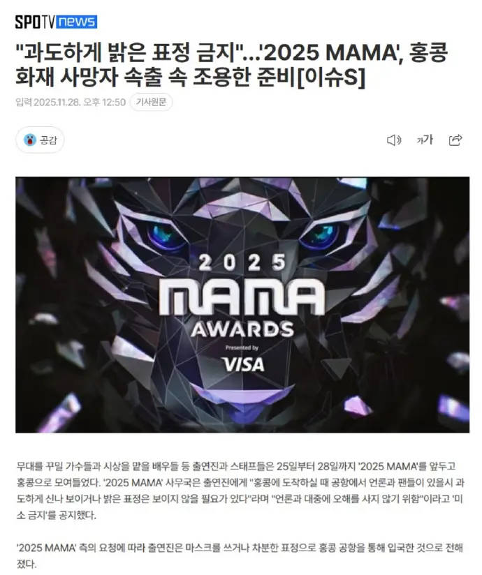 搜狐娱乐讯 11月28日,据韩媒报道,MAMA组委会向艺人下达了“禁笑令”。组委会要求艺人抵达香港时,请勿做出过度兴奋或过于明亮的表情,同时也传达了其他多项注意事项,建议艺人在舞台前后的反应保持平稳、沉静的语气(避免引导现场观众进行热烈回应);在态度上表达追悼、安慰与对中国香港市民的尊重(舞台开场与结束的问候也建议降低情绪强度,以体现礼貌、温暖与体贴,而非欢呼式气氛);禁止发表可能引起政治误解的言论(应以音乐传达疗愈、团结与温暖的慰问,为香港市民带来希望与勇气的用语);追悼丝带可由艺人自愿佩戴,完全没有问题;通知两天的节目中均不会安排“全体艺人共同出场”的最终大合流环节。